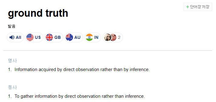 Informationacquiredbydirectobservationratherthanbyinference. 즉, Ground Truth는 추론에 의해 제공되는 정보가 아닌 직접 관찰 및 측정에 의해 제공되는 실제 또는 사실로 알려진 정보를 의미한다. 조금 더 쉽게 설명하자면 이미지의 label 데이터를 말한다.