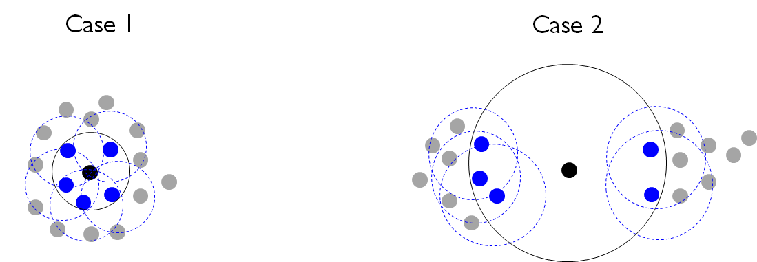 - case 2: p is located in a spare are between two dense clusters: the denominator of lrd_k(p) becomes large, which results in a small lrd_k(p)