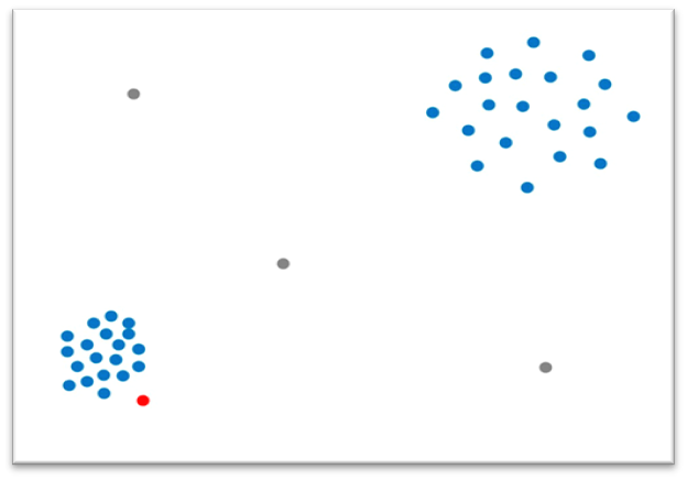 그저 거리만 고려해 이상치를 판별 하게 된다면 회색 점에 대해서는 이상치라고 판별하지만, 빨간 점에 대해서는 이상치로 판별하기 어렵다. 즉 특정 집단에서는 매우 가까운 거리가, 다른 집단에서는 매우 먼 거리일 수 있으니 객체의 지역적인 밀집도를 고려해 이상치 점수를 계산하자.