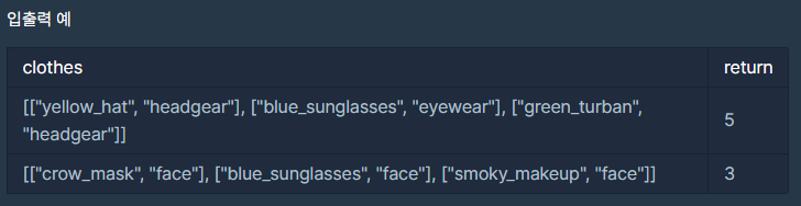 스파이가 가진 의상들이 담긴 2차원 배열 clothes가 주어질 때 서로 다른 옷의 조합의 수를 return 하도록 solution 함수를 작성해주세요.