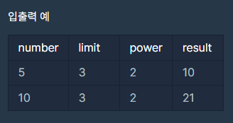 기사단원의 수를 나타내는 정수number와 이웃나라와 협약으로 정해진 공격력의 제한수치를 나타내는 정수limit와 제한수치를 초과한 기사가 사용할 무기의 공격력을 나타내는 정수power가 주어졌을 때, 무기점의 주인이 무기를 모두 만들기 위해 필요한 철의 무게를 return 하는 solution 함수를 완성하시오.