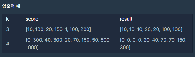 명예의 전당 목록의 점수의 개수k, 1일부터 마지막 날까지 출연한 가수들의 점수인score가 주어졌을 때, 매일 발표된 명예의 전당의 최하위 점수를 return하는 solution 함수를 완성해주세요.