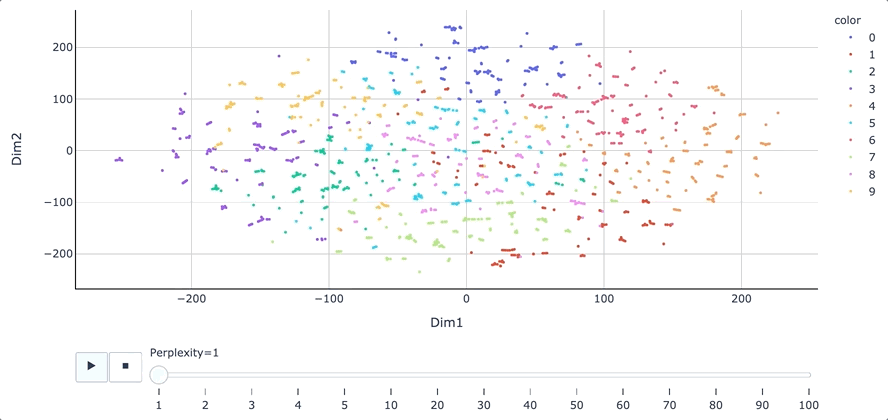 - $x_i$와 같은 개수의 점 $y_i$를 낮은 차원 공간에 무작위로 배치하고, 모든 i, j 쌍에 관하여 $y_i$, $y_j$의 유사도를 t-SNE를 이용해 나타냄