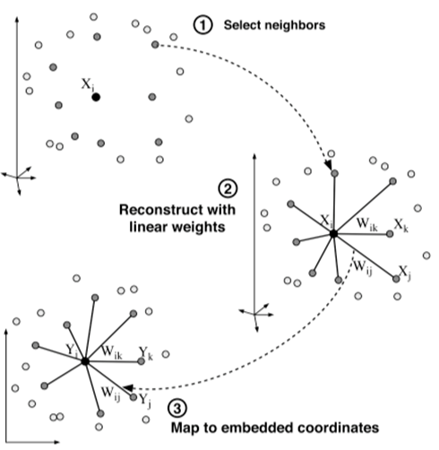 데이터 포인트와 그의 이웃점은 매니폴드의 locally linear patch상에 있거나 가까이 있을거라 가정. 이 가정을 바탕으로 데이터 포인트를 재구성하는 가중치 w를 구한다.