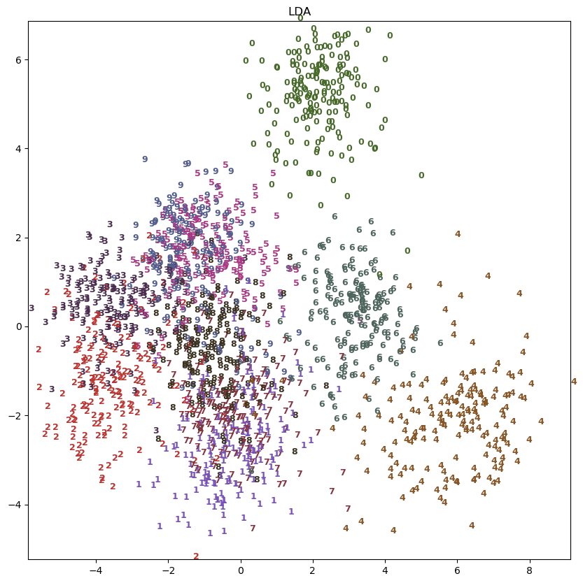 plt.text(digits_lda[i, 0], digits_lda[i,1], str(digits.target[i]),