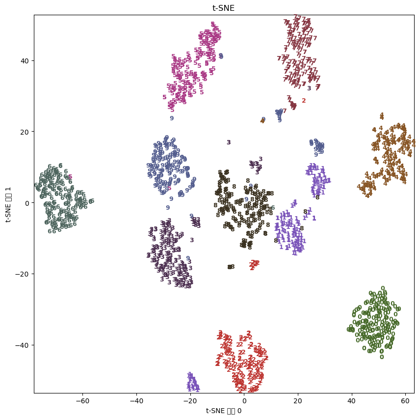 높은 차원의 복잡한 데이터를 2차원에 차원축소하는 방법이다. 고차원 공간에서 유사한 두 벡터가 저차원에서도 유사하도록 원공간에서 점들 간의 유사도를 보존하며 차원을 축소한다. 시각화에 주로 사용하며 대표적으로 워드 임베딩을 시각화할 때 사용된다. 이전에 소개한 PCA, LDA와 달리 비선형적인 차원 축소 방법이다.
