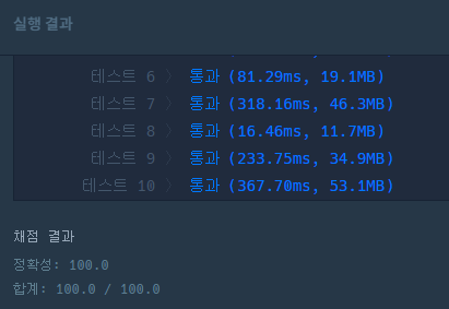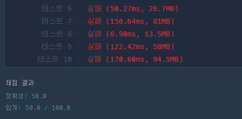 테스트 케이스는 전부 통과하는데 실제 테스트 케이스는 통과 못함... 뭐가 문제인지 감도 안잡혀서 그냥 코드를 다른 방식으로 짜기로 함