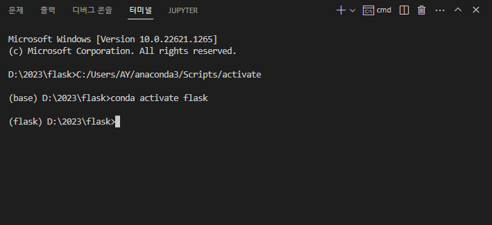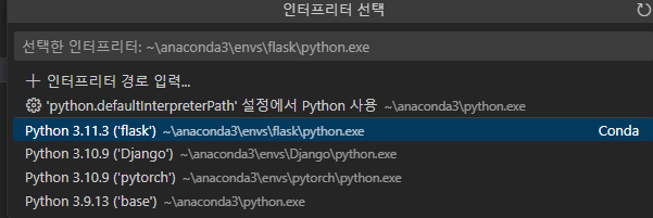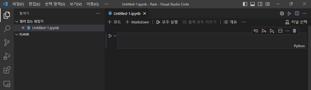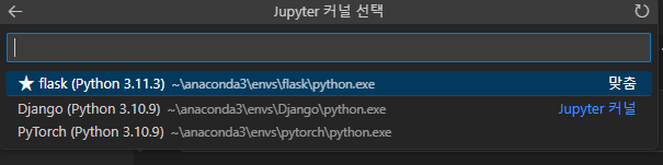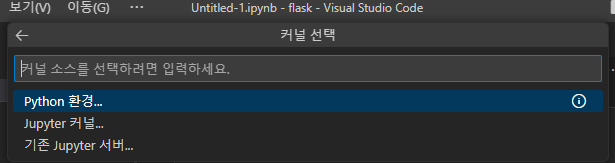 방금 만든 flask가 있는 걸 볼 수 있다. 여기서 flask를 선택해 커널을 연결해주자.