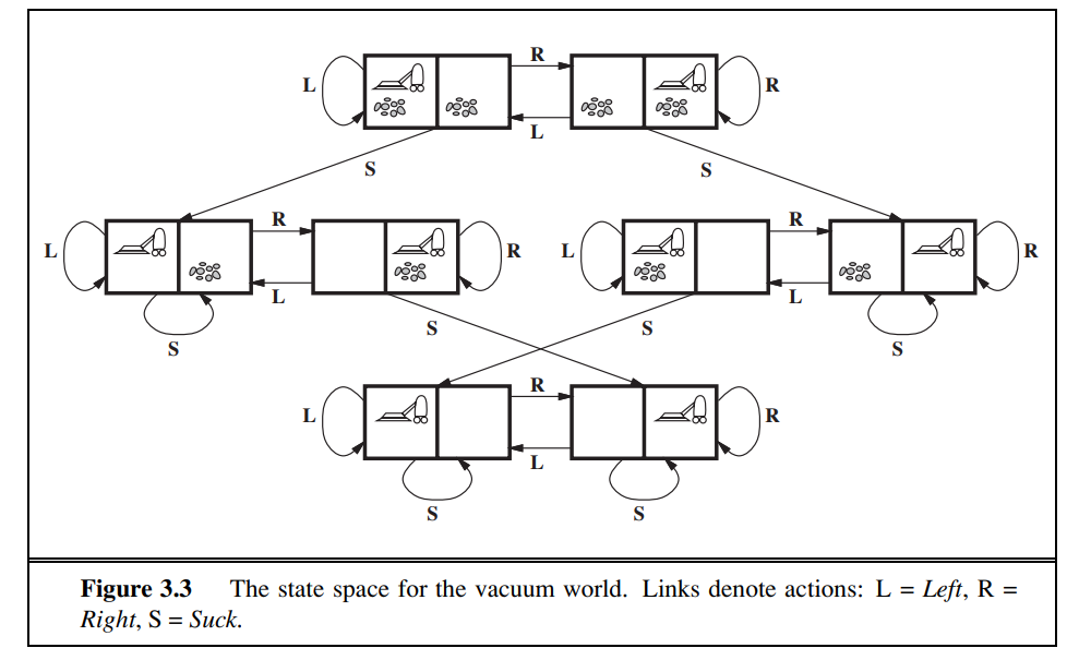 States : 여기서 상태는 에이전트(청소기)의 위치와 먼지의 위치 모두에 의해 결정된다. 에이전트는 두 위치 중 하나에 있으며, 이 위치에는 먼지가 있을 수도 있고 없을 수도 있다. 따라서 가능한 states는 $2 \times 2^2=8$개가 된다. 가능한 location이 많아지면 $n \times 2^n$개의 states가 된다. Initial state:모든 상태를 초기 상태로 지정할 수 있다. Actions: 이 간단한 환경에서는 각 상태에는 세 가지 동작만 있습니다: Left, Right, 그리고 Suck. 환경을 확장한다면 Up과 Down도 포함될 수 있다. Transition model: 오른쪽으로 이동, 왼쪽으로 이동, 흡입하기. 가장 왼쪽 사각형에서 왼쪽으로 이동하기, 가장 오른쪽 사각형에서 오른쪽으로 이동하기, 깨끗한 사각형에서 흡입하기는 아무런 효과가 없다. Goal test: 모든 사각형이 깨끗한지 확인한다. Path test: 각 단계의 비용은 1이므로 경로 비용은 몇번 작업을 수행했는가이다.